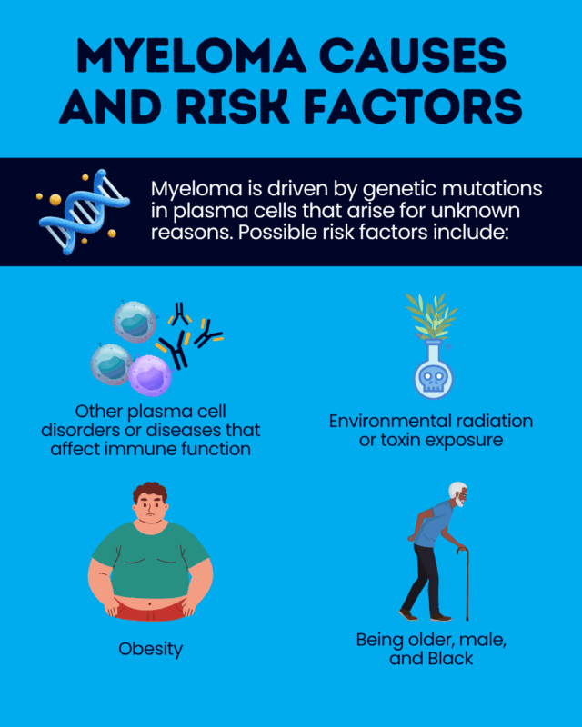 Many myeloma risk factors are beyond a person’s control, and there is no definitive strategy for myeloma prevention. Still, understanding myeloma causes can help individuals manage modifiable risk factors and be aware of their individual need for monitoring to enable early disease diagnosis and treatment.