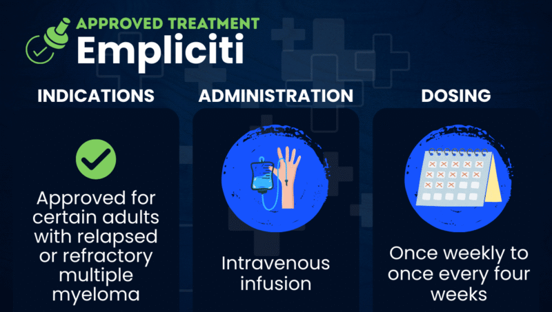 Empliciti (elotuzumab) is an infusion therapy approved for use in combination regimens for adults with multiple myeloma that did not respond to (refractory) or returned after (relapsed) other treatments.