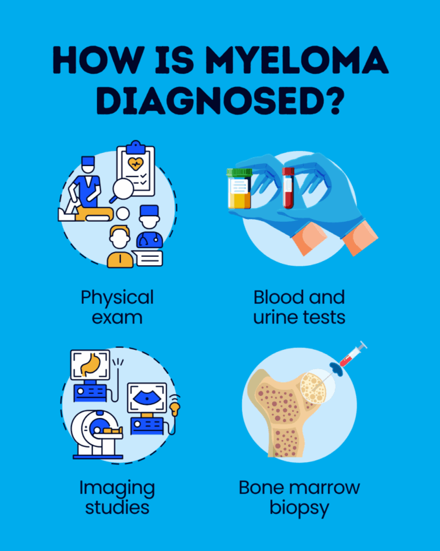 A diagnosis of myeloma is usually reached based on the collective results of a physical exam, blood and urine tests, bone marrow examination, and imaging studies.